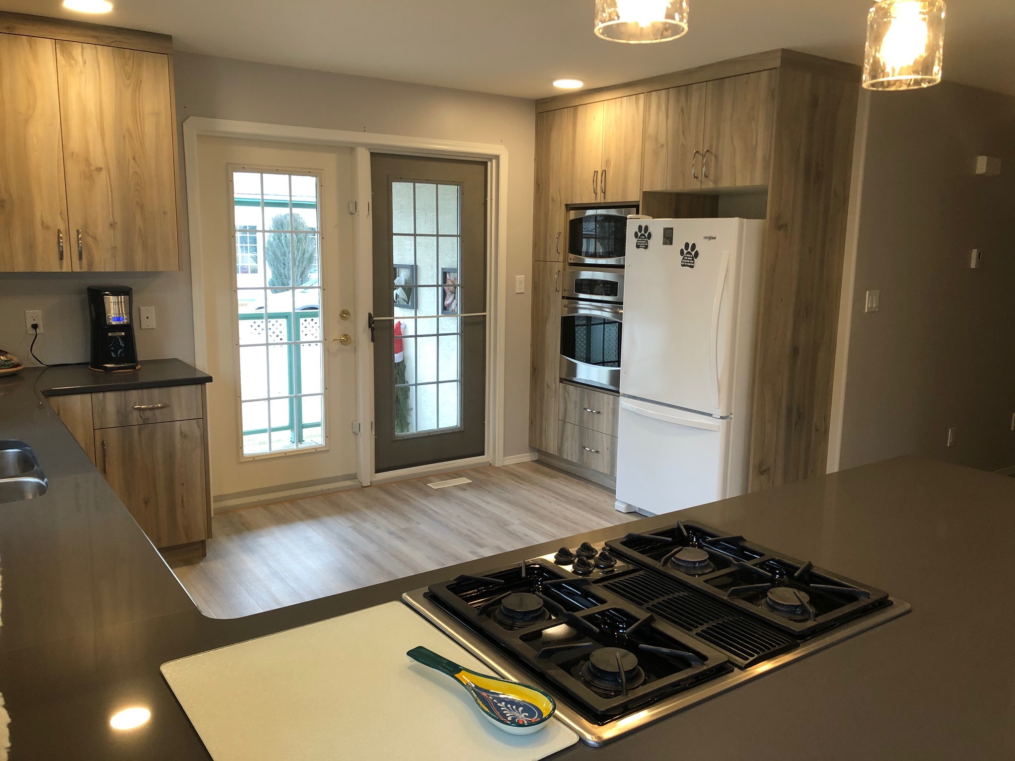 In this renovation, all the kitchen cabinets were removed as well as the separating wall between the kitchen and dining room to make this one large room. We repaired the drywall as well as replaced the cabinetry, flooring, lighting. With fresh paint, the difference from start to finish is astounding. Check out the last two pictures for the before remodel.