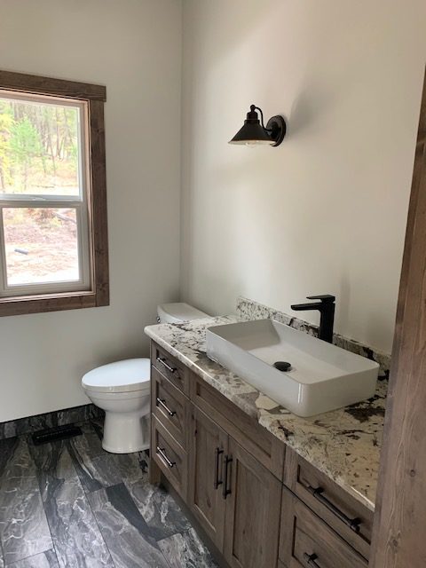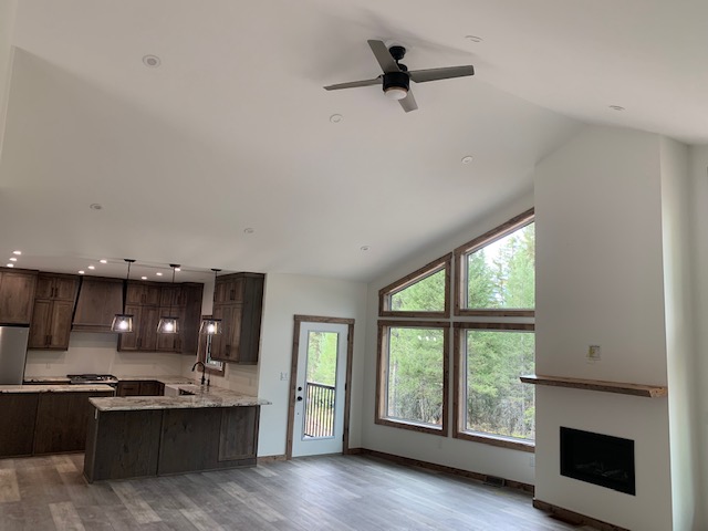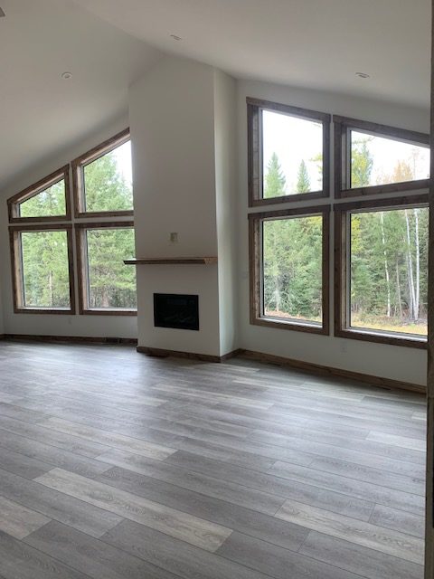 As you walk into the front doors, this floor has the living room with vaulted ceilings throughout and gorgeous views of the forest and mountains from the floor to ceiling windows. The kitchen and dining room are also eye catching as you walk through the main doors. The master bedroom, ensuite and closet are the final features to the main floor living area.